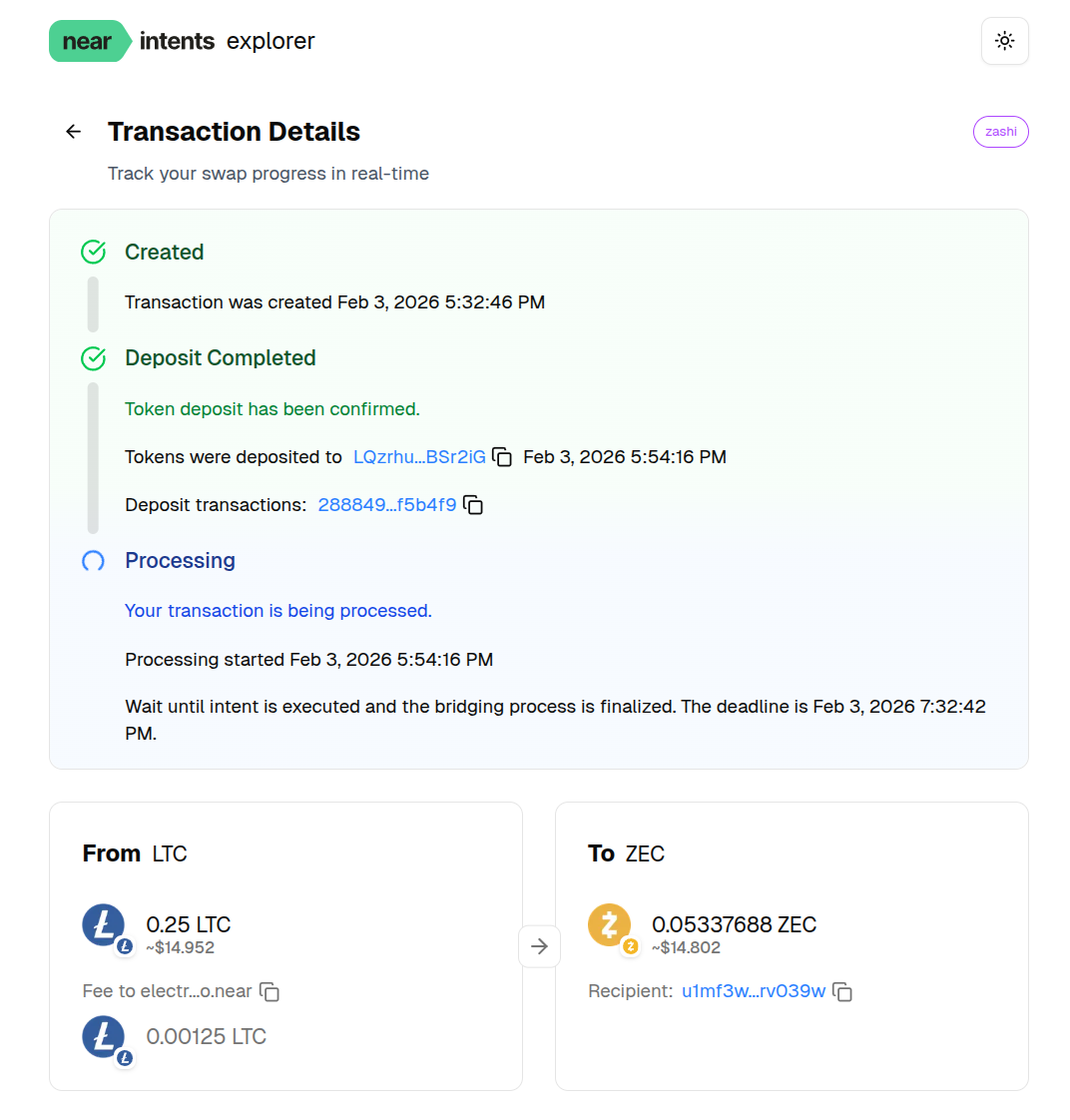 If you've placed a deposit for a swap, you can view more details about its current status on the NEAR Intents Explorer:
