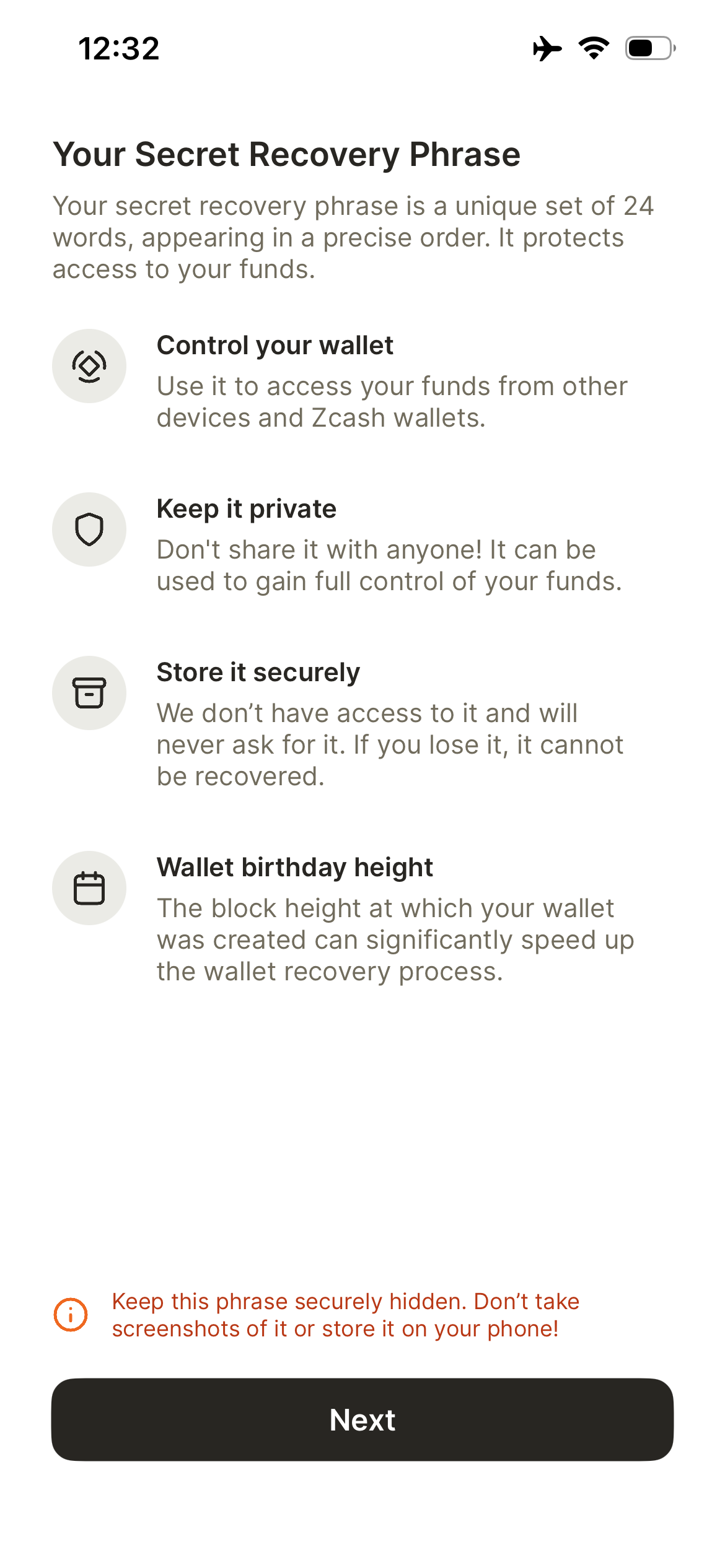 Note! If you do not back up your recovery phrase, you are at risk of losing your ZEC. Funds in Zodl cannot be recovered otherwise, and we do not have access to your phrase and cannot help you recover it.
