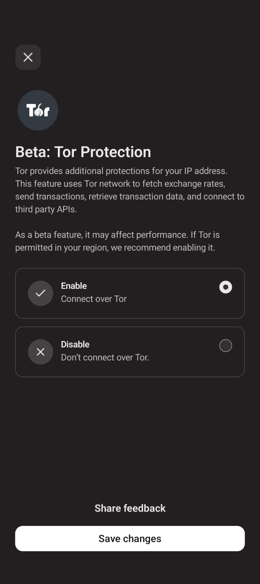 Tor provides additional protection for your IP address. Enabling this feature will mean Zashi will use the Tor network to fetch exchange rates, send transactions, retrieve transaction data, and to connect to third party APIs.