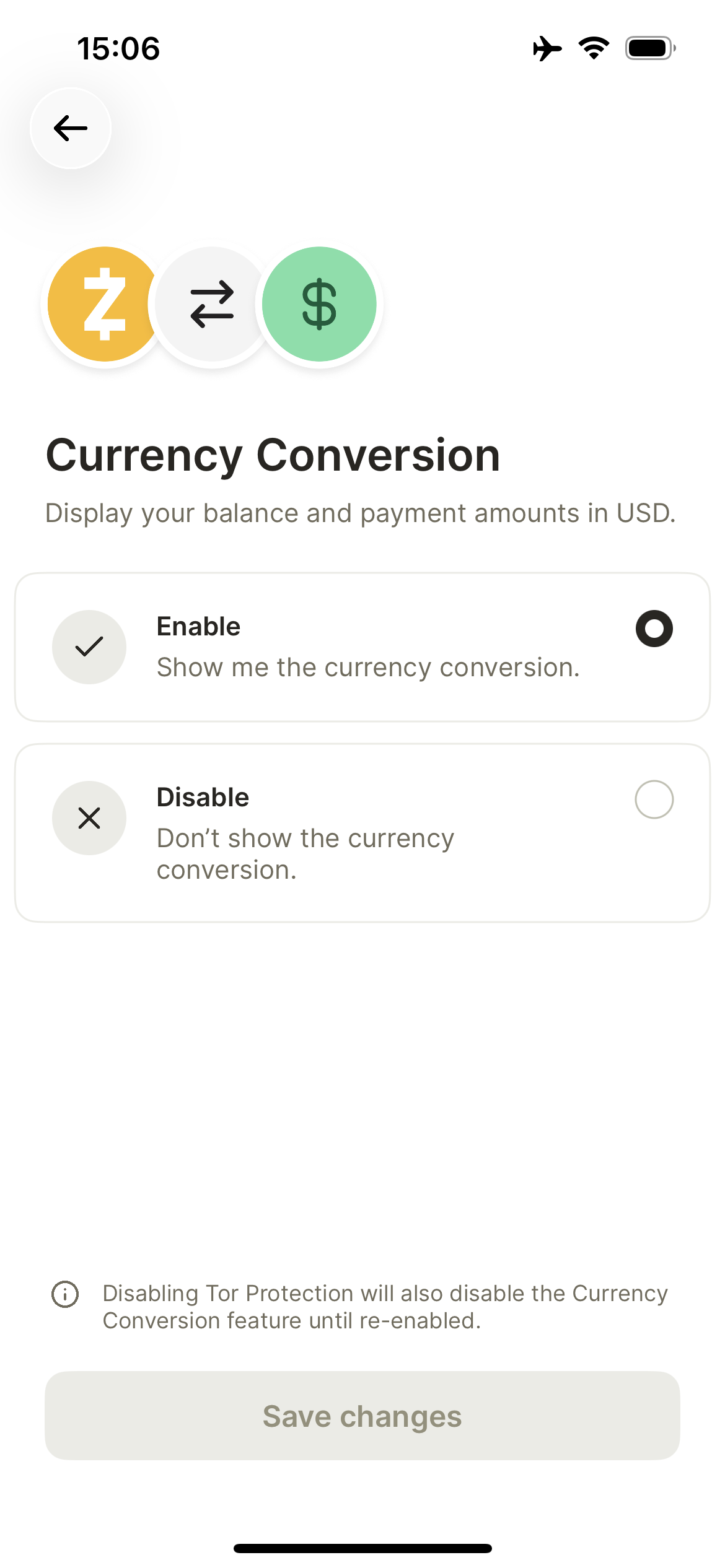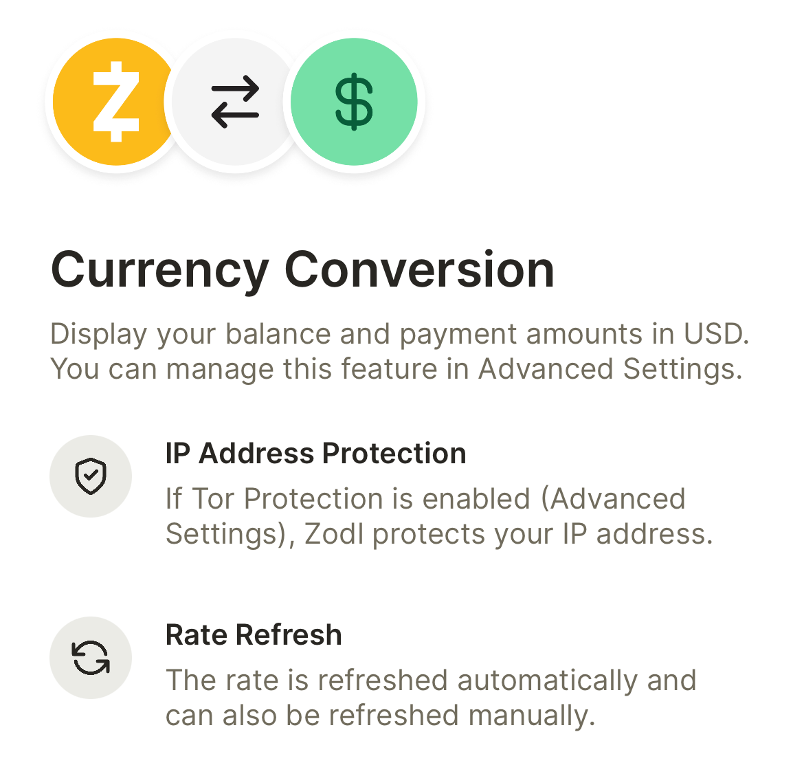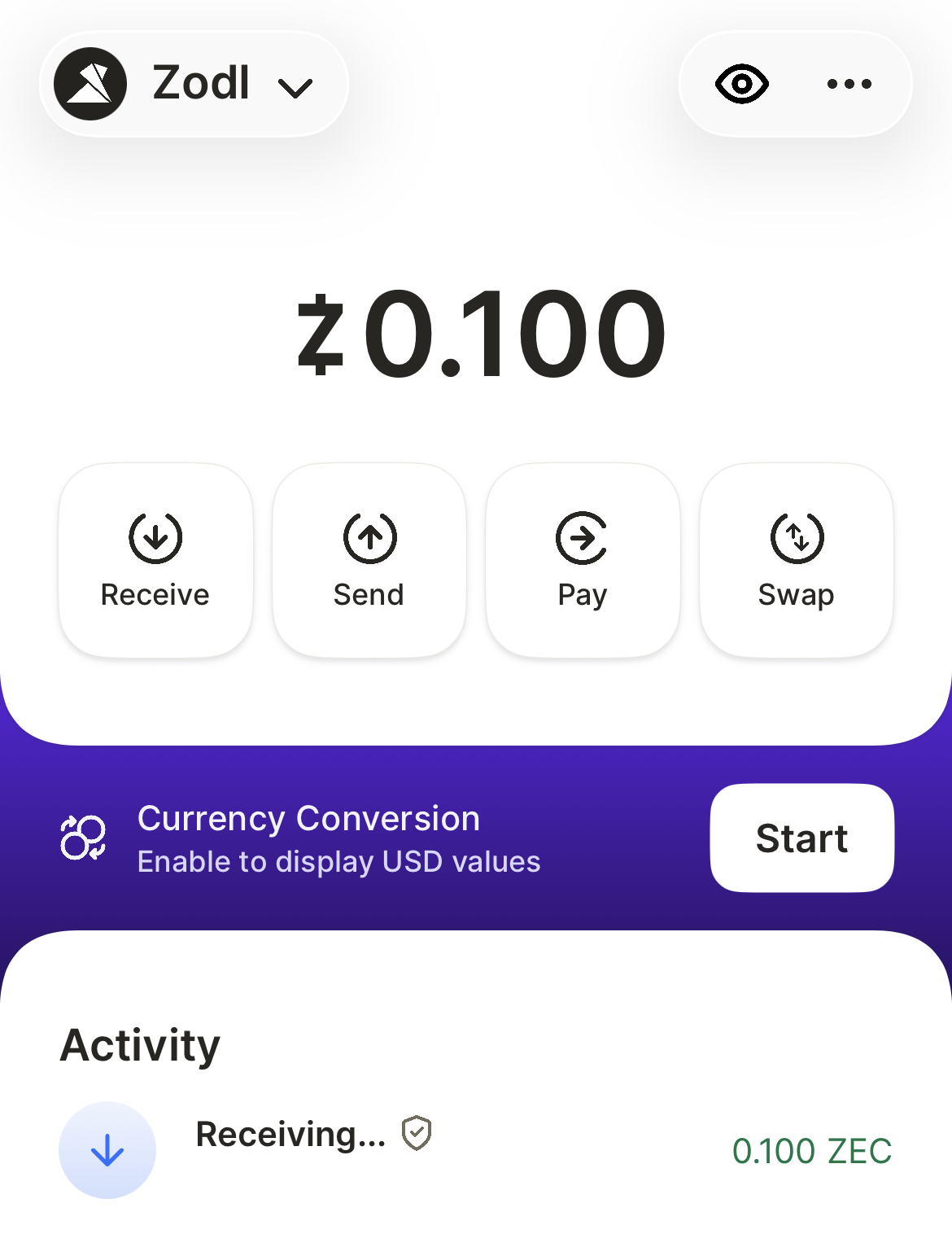 By default, Zodl does not enable currency conversion to USD to protect your privacy.